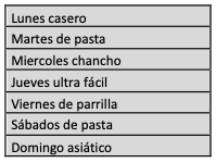 2. Hacer menú: definir un plato para cada día de la semana. Para hacer esto más fácil y ponerle un toque de entretención definimos una temática para el plato diario de cada día de la semana.