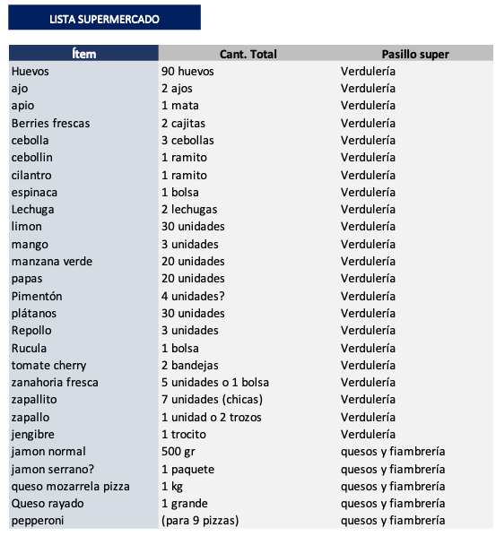 3. Listado supermercado: basándome en el menú definido, realicé un listado de los productos y las cantidades.