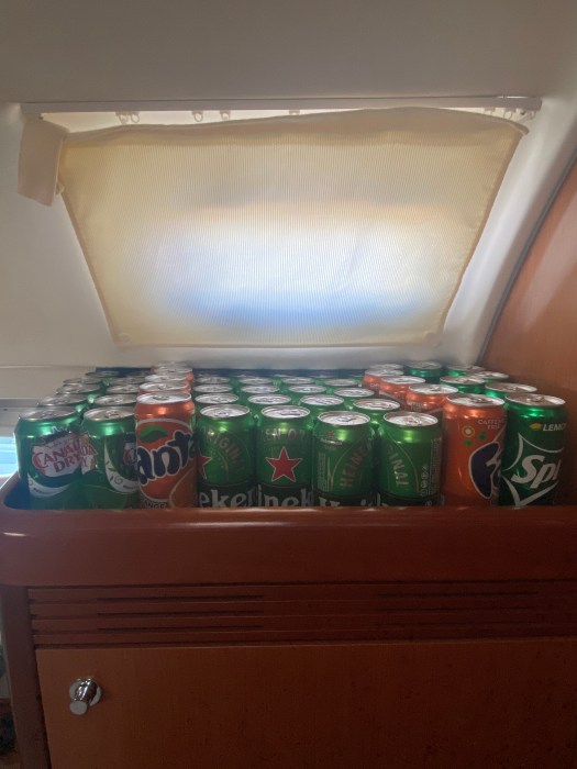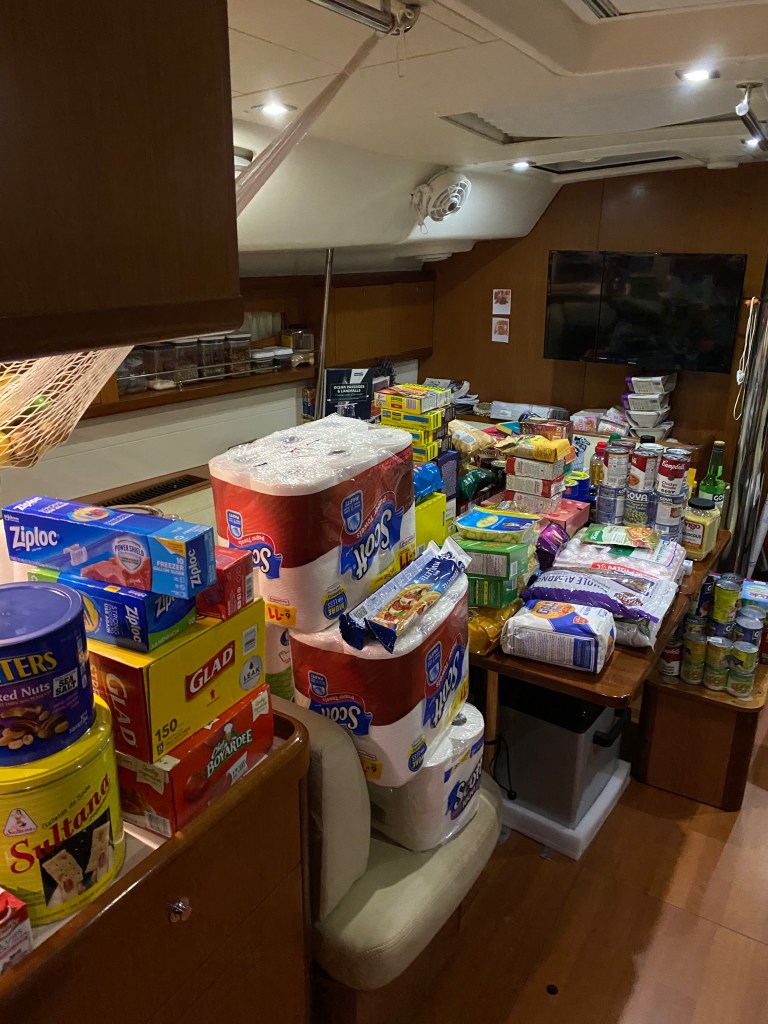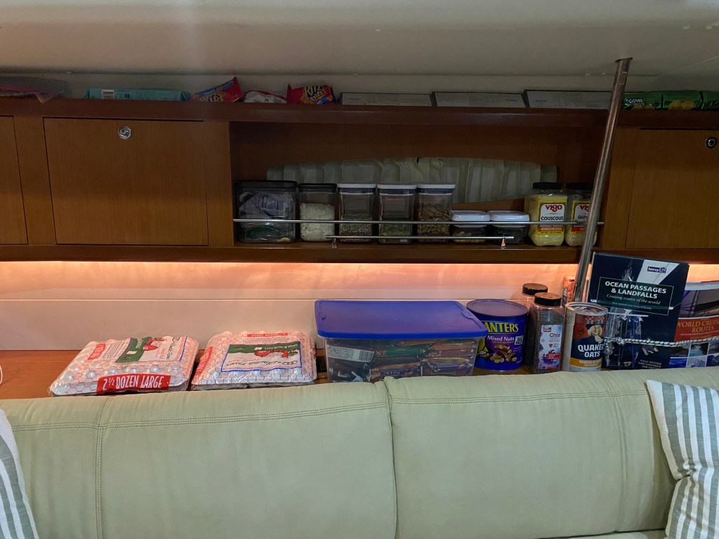 1. Definir cuantas comidas diarias y sistema de desayuno y snacks. Nosotros definimos que el desayuno cada uno se lo preparaba cuando guste (debido a los diferentes turnos), definimos una comida diaria en conjunto y snacks para todos los días cuando cada uno necesitara. No puedes tener todos los horarios tan rígidos dado que por el sistema de turnos las horas de alimentación que les acomoda a cada uno varían. Lo importante es definir el numero de comidas para calcular las cantidades. La gente suele sobre-estoquearse demasiado para un cruce largo y si bien mas vale que sobre a que falte, siempre es mejor darse el trabajo de hacer unos cálculos estimativos y respetarlos ya que el espacio de almacenamiento es clave en un barco, sin considerar el hecho de cuidar el presupuesto y no derrochar comida.